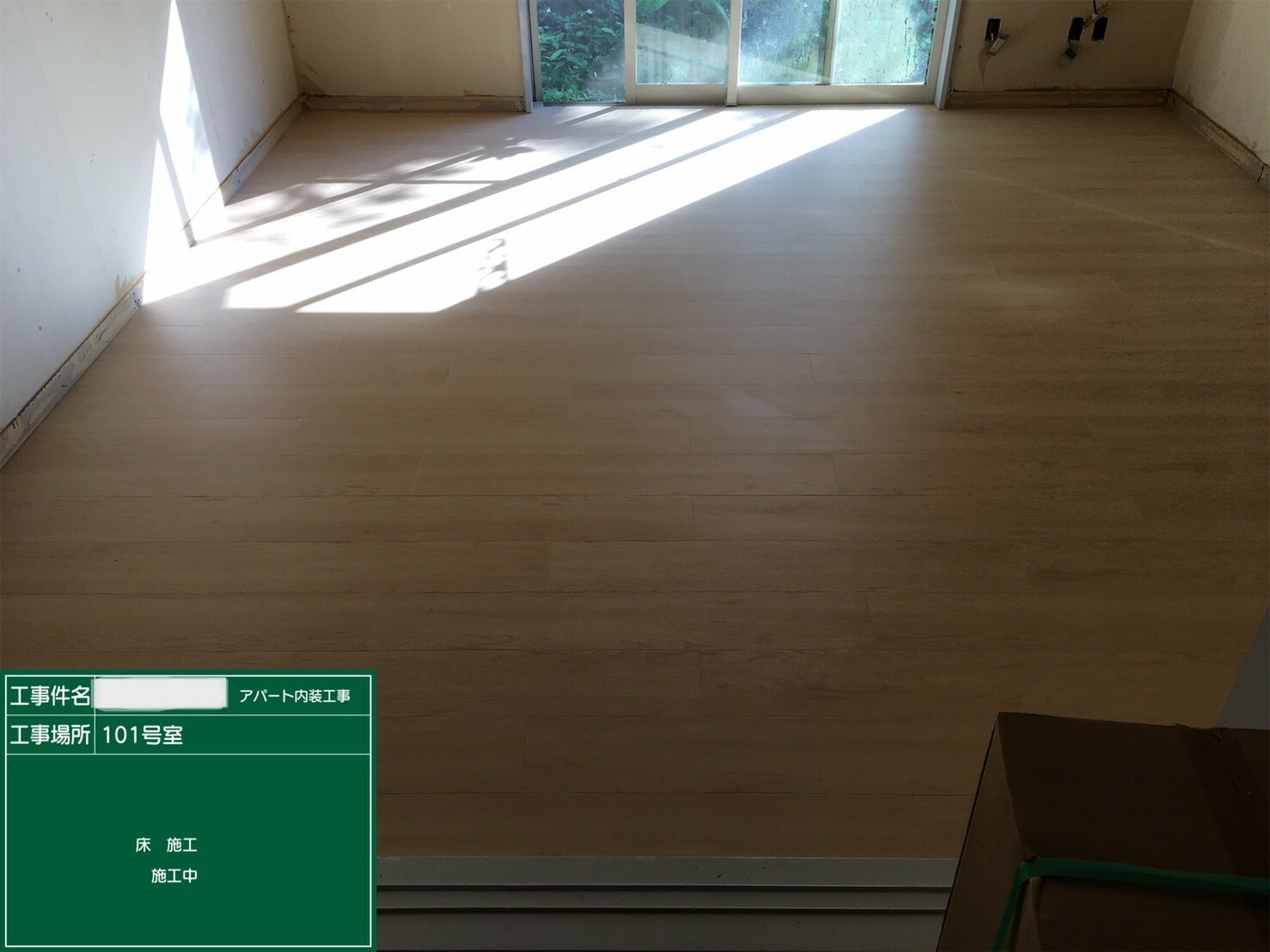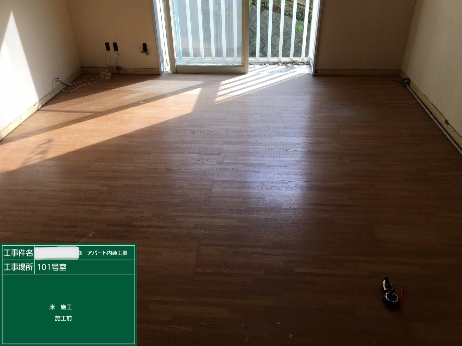 アパートのフローリング張替え(上張り)工事の様子です。上張りは既存床の撤去・処分費用がかからずコストを抑えることができます。見た目が綺麗になるのはもちろんのこと防音効果もあがり、集合住宅の問題が1つ解決しました。