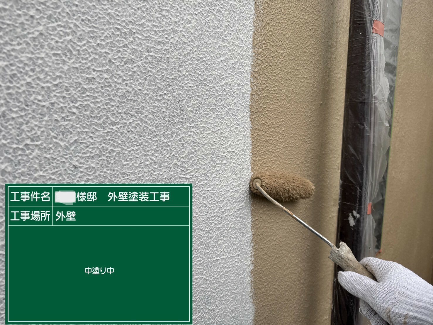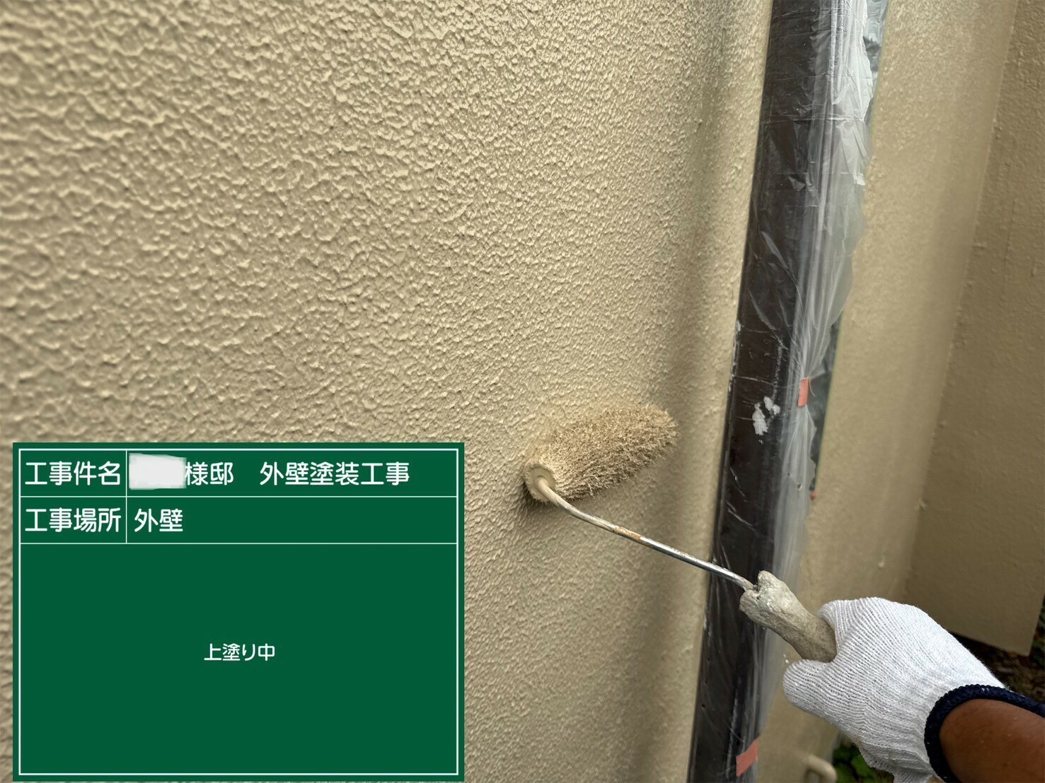外壁の塗装工事を行いました。鎖骨ローラーというヘチマのような穴の開いた特殊なローラーで、粘度の高い塗料を厚く塗って凹凸模様を作ります。肉厚な塗膜になる為、ひび割れに強い耐久性を持たせることができます。