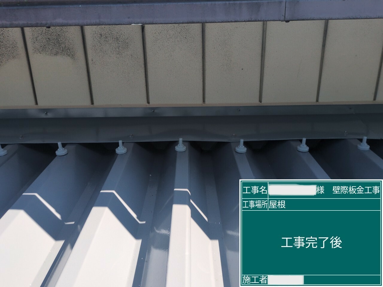 壁から雨水がつたって窓枠から水が入り込んで困っているとのご相談がありました。波型屋根と壁の隙間を面戸板金で塞ぎ、さらに上から壁際に板金をつけることで雨水が侵入しにくくなる環境を作ることができました。